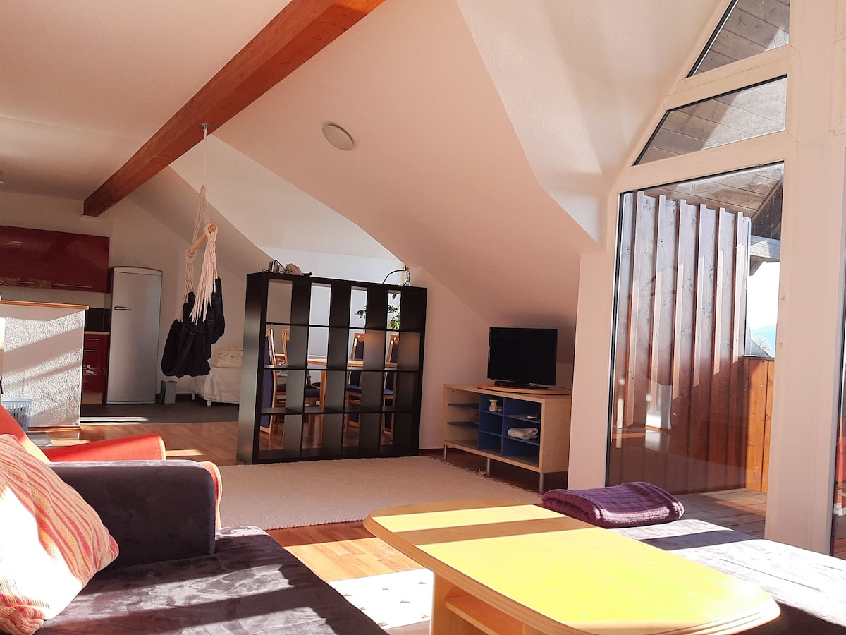 Loft dans l'atelier Ce loft élégant et confortable dans l'atelier d'Etienne est situé à la lisière de la forêt, juste à l'extérieur de Bad Ischl. Les amateurs d'art et de nature en ont pour leur argent. Va à la rencontre de l'artiste Etienne, qui peint au rez-de-chaussée de l'atelier. La vue sur le paysage de montagne pittoresque est enivrante. Depuis la terrasse du côté est, tu peux profiter du soleil du matin au petit déjeuner et tu as une vue magnifique sur le jardin avec étang et barbecue.