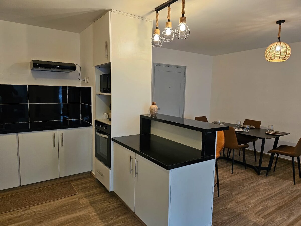 Appartement cosy et confortable de 56 m², situé dans une résidence calme et sécurisée proche de toutes commodités (restaurants, boulangeries, commerces). Vous apprécierez ce logement pour son confort, sa situation géographique et son style moderne. ll est parfait pour les couples, et les voyageurs d'affaires. Il est composé d'une chambre, d'un salon, d'une cuisine, d'une salle de bain et d'une terrasse. Spacieux et bien équipé, il comprend tout le nécessaire pour se sentir comme chez soi.