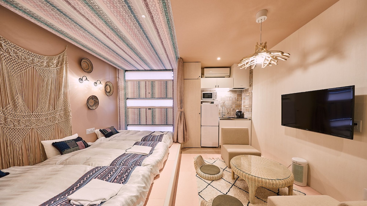Le « DISTORTION 9 » qui expose de l'art d'artistes extérieurs est un hôtel-galerie ouvert en juillet 2020. <Ceci est la page de réservation pour la partie du 1er étage uniquement.> Vous pouvez également utiliser en privé le bain extérieur sur le balcon du 1er étage. Il y a aussi une salle de douche à l'intérieur. Il peut accueillir jusqu'à 4 personnes, mais si vous souhaitez réserver 2 étages (1er et 2e étage) en une seule réservation, il peut accueillir jusqu'à 8 personnes. Veuillez nous contacter avant de réserver si vous souhaitez louer 2 étages. Les œuvres exposées dans la galerie sont des œuvres d'art brut créées quotidiennement au centre d'art et de bien-être « Yamanami Kobo » situé dans la ville de Kaga, dans la préfecture de Shiga. Vous pouvez acheter des œuvres d'art originales dans les distributeurs automatiques situés devant l'hôtel, en plus de celles exposées dans le bâtiment. Vous pouvez regarder des films Amazon Prime sur le grand écran de télévision à l'intérieur. C'est probablement la seule chambre avec bain en plein air à Osaka Namba. Portez un maillot de bain ou fermez les rideaux et profitez lentement de l'ambiance du complexe hôtelier.