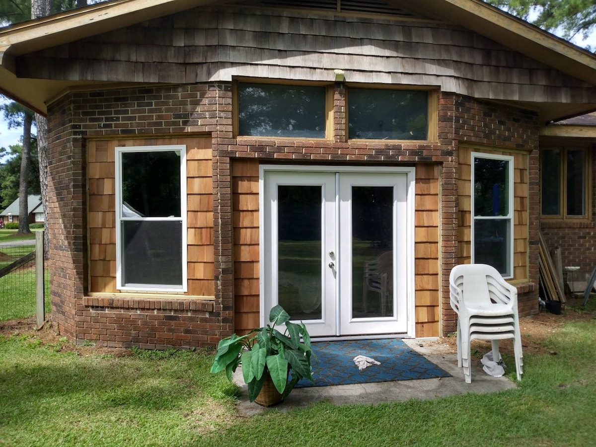 Studio paisible et calme situé à 3 miles au sud d'Ayden. À 15 minutes au sud de Greenville/Winterville. Campagne à 700 pieds de l'autoroute 11. À 1/4 mile d'un grand marché aux puces le mercredi et le samedi. Télévision connectée Ruku 43" 4k UHD, grande douche 34"x 48". Meuble-lavabo de 36". Placard 4'x5'. Je m'efforce de maintenir mes normes de propreté au-dessus des normes de l'industrie. Chauffage/climatisation à télécommande. La télévision est montée sur le mur. Serviettes, gants de toilette, vaisselle, argenterie, savons. Porche de 6' x 12'.