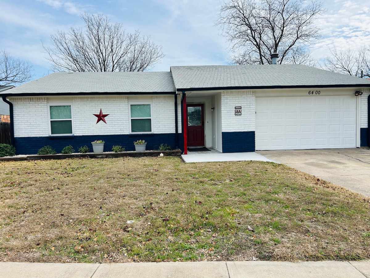 Maison récemment rénovée de 3 chambres et 2 salles de bain (2 lits King Size, 1 lit Queen Size) À moins de 30 minutes de : Aéroport DFW Centre-ville de Ft Worth Six Flags et Hurricane Harbor Circuit automobile du Texas Grapevine Mills Centre-ville de Grapevine Parc aquatique NRH20 Karting Route 377 Bowling Simulateur de chute libre. À 35 minutes de : TCU WiFi gratuit, TV par câble, accès au garage, cuisine entièrement équipée et buanderie, draps et serviettes propres, shampoing/après-shampoing, café, collations, fruits, boissons gazeuses. *Matelas jumeaux gonflables sur demande.