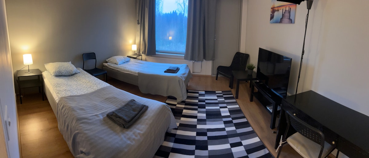 Détendez-vous avec une famille ou un groupe d'amis dans ce logement paisible. En relation avec la maison, une cheminée avec une chaise de massage. Possibilité sauna et glacière dans un flasque abrité. Remarque ! Apportez vos propres draps et serviettes de bain ? Si nécessaire, en acceptant à l'avance les draps et serviettes peuvent être loués à un prix séparé. (12 € / personne) J'ai aussi un autre appartement de la même taille dans la même maison sur Airbnb à louer. https://www.airbnb.fr/h/kirkkokuja