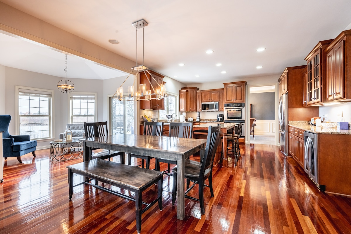 Escape to a peaceful riverfront retreat set on over half an acre with beautiful water views! Ideal for families, couples, or golf groups, the home offers wildlife sightings, a cozy fireplace, fire pit, game room with PlayStation, and kayaks included to explore the river. Watch the full moon rise from the patio. Breakfast, private chef, sound healing yoga and private driver are available upon request (additional fee). Golf, dining, shopping, and Illinois’ largest water park are just minutes away.