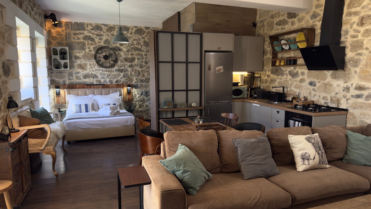 Rez-de-chaussée, chambre individuelle, maison individuelle en pierre, avec un grand jardin en bordure du village tranquille de Stavros, à 10 minutes en voiture du centre-ville, idéal pour le repos et la détente. Profitez de la vue dégagée sur la mer de Libye et les montagnes environnantes, dans un paysage naturel calme qui offre intimité et tranquillité. La maison est entièrement équipée pour un séjour confortable et est un choix idéal pour les couples, les voyageurs solitaires ou ceux qui veulent un peu de déconnexion de l'intensité de la vie quotidienne