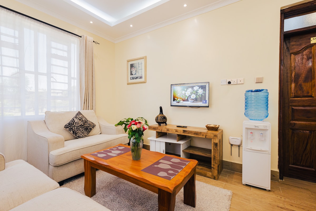À seulement 5 minutes à pied de la plage de Nyali, ce studio accueillant offre tout ce dont vous avez besoin pour profiter des vacances, de la rencontre ou du séjour parfaits dans la région côtière de Mombasa/ Kenya. The Space est l'endroit idéal pour se détendre après une journée d'exploration/de travail, avec un lit moelleux en teck africain (mvule), un plan de travail et un écran plat mural avec accès à des centaines de chaînes. L'appartement dispose d'un réfrigérateur, d'un micro-ondes qui vous fera vous sentir comme chez vous.