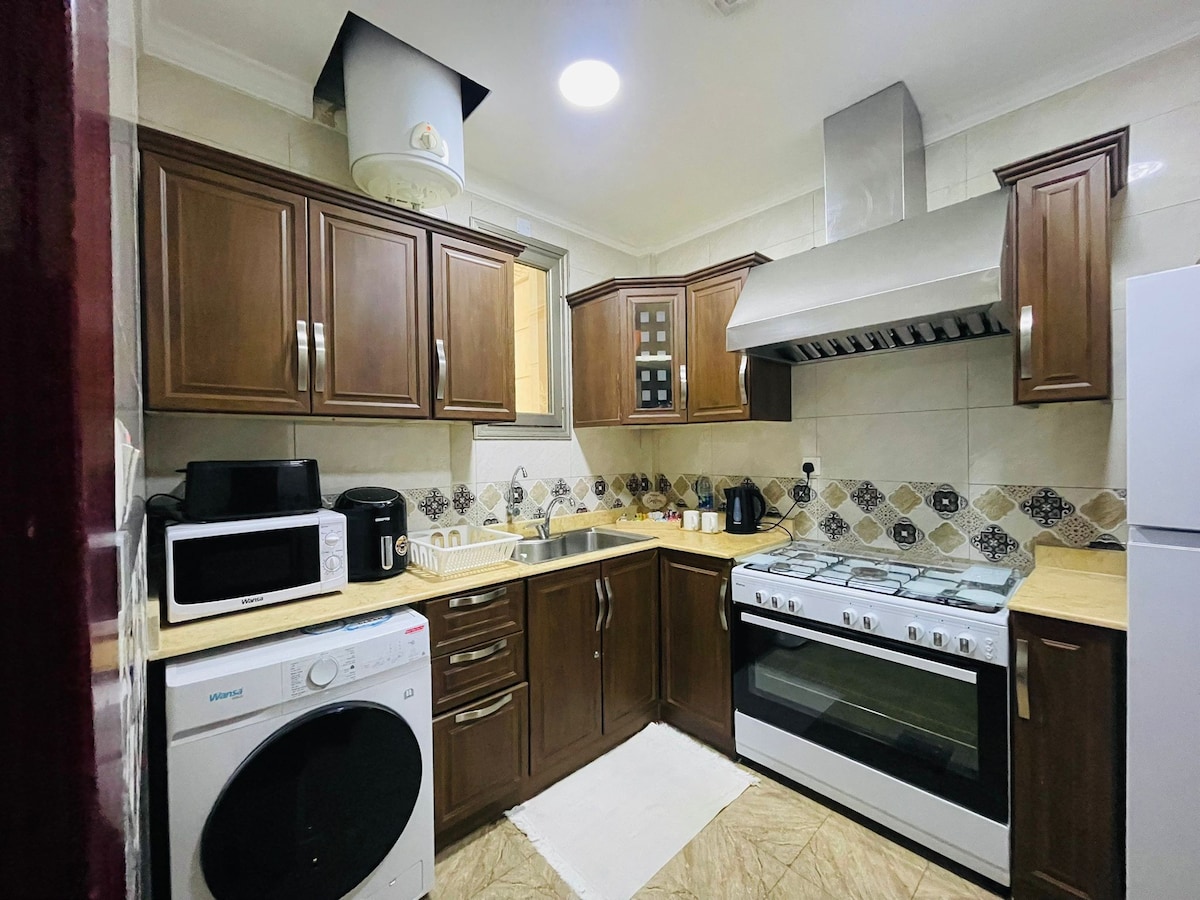 Le mélange parfait d'un séjour simple, abordable et confortable au cœur de Salmiya. *Arrivée autonome(code fourni avant l'arrivée * L'appartement dispose de 2 chambres, dont une principale avec salle de bain attenante. *Les deux chambres disposent de lits queen size (160*200) parfaits pour 2 personnes. * L'appartement dispose d'une connexion Internet 5G * Téléviseur Samsung 70" dans le salon et téléviseur Wansa 55" dans la chambre principale avec Netflix, Prime Video et YouTube. * Tous les articles de toilette de base sont fournis * Cuisine avec appareils de base, y compris lave-linge. *Réfrigérateur avec minibar