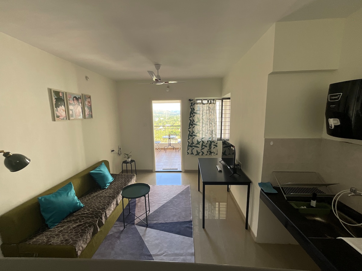 White Lotus Highway Den | Balcony Views & Peaceful Studio Wake up to mountain views and fresh highway breeze 🌿 A calm, compact studio with a balcony and kitchenette — ideal for travellers, couples & remote workers. ⸻ 🌿 Perfect For Couples, solo travellers, digital nomads, or anyone driving between Pune, Satara, Kolhapur or Bangalore looking for a peaceful overnight stop instead of a hotel.