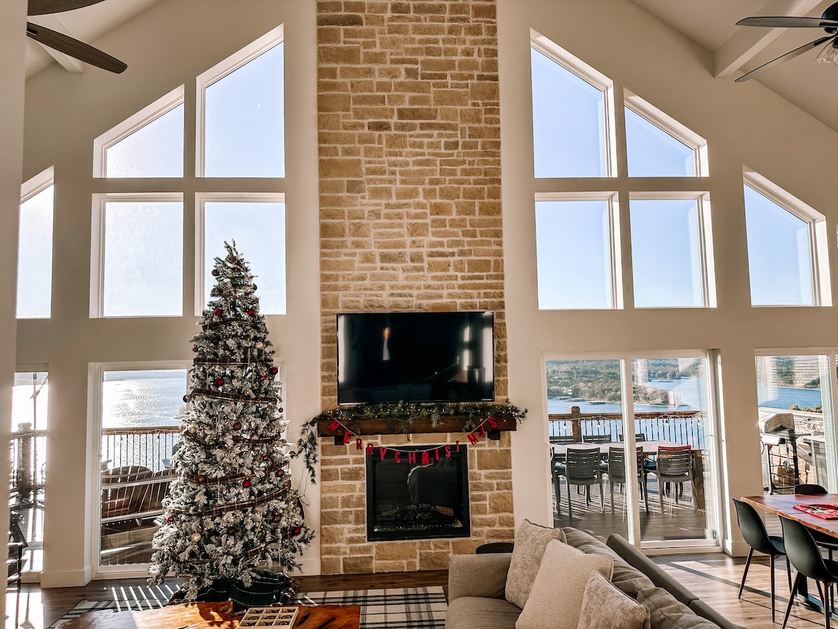 Profitez de VUES IMPRESSIONNANTES sous tous les angles du « Falcon's Nest », un chalet moderne au bord du lac Branson ! Détendez-vous autour du patio personnalisé avec télévision et cheminée, hamacs, foyer et jeux extérieurs ! Profitez d'heures de plaisir dans notre SALLE DE JEUX avec arcades et mur d'escalade, piscines INTÉRIEURES et EXTÉRIEURES et une RIVIÈRE PAISIBLE. Imprégnez-vous de la beauté des montagnes Ozark depuis le séjour ouvert avec plafond voûté et mur de fenêtres. Ou profitez d'une soirée spéciale autour du foyer surplombant les eaux du lac Table Rock.