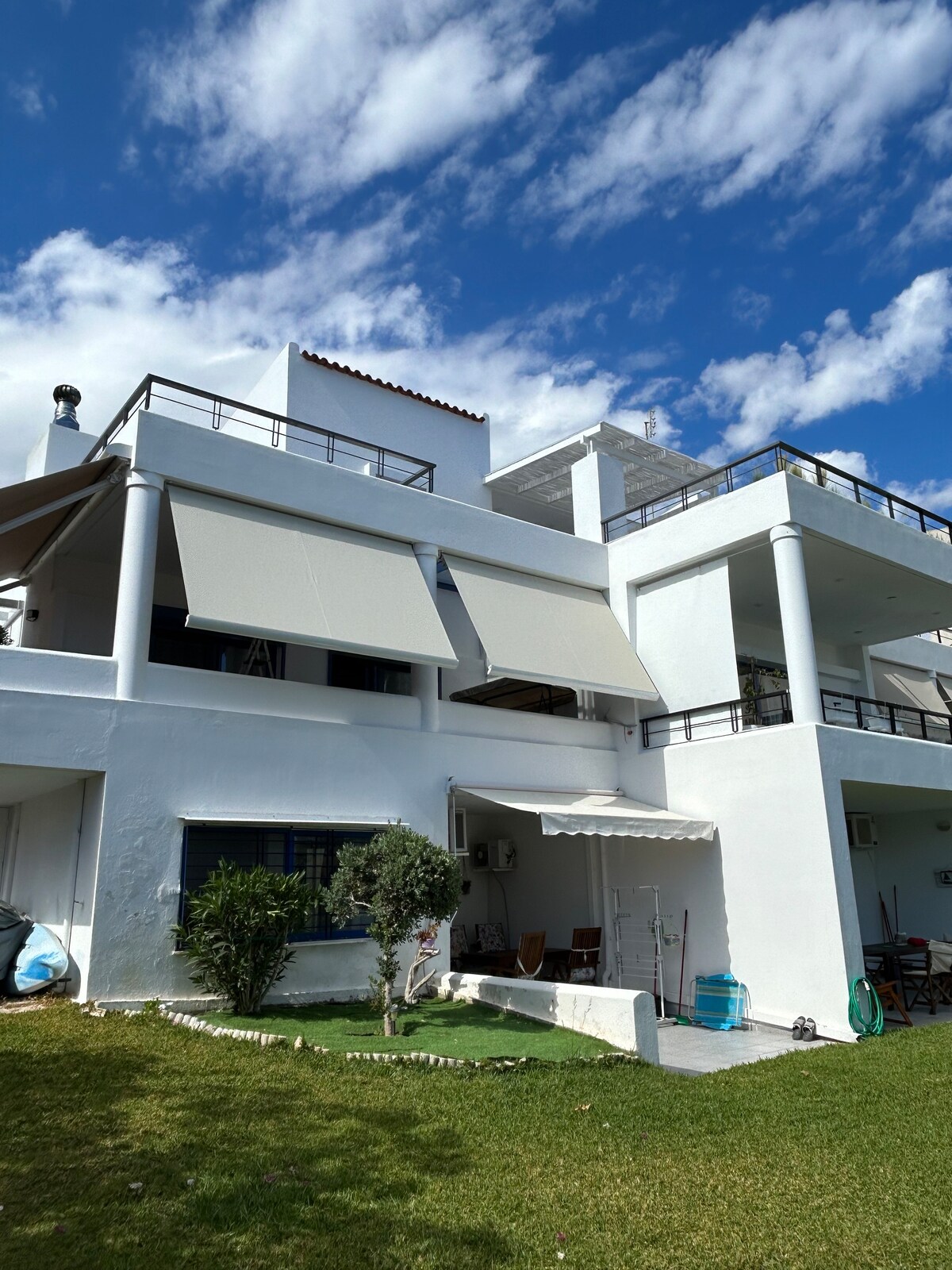 Notre appartement de vacances de 45 m2 récemment rénové est élégant, minimaliste mais confortable pour que vous vous sentiez comme chez vous. Un havre de blanc et de gris pâle, l'appartement est baigné de lumière naturelle toute la journée. Notre terrasse privée de 100 m2 vous offrira toute la sérénité et la tranquillité dont vous avez besoin pendant vos vacances en profitant de la vue imprenable sur la baie de Vouliagmeni. Proche des plages, école de ski, court de tennis, terrain de basket, hôtels, restaurants, forêt, parcs, à 30 min du centre d'Athènes, à 30 min de l'aéroport d'Athènes.