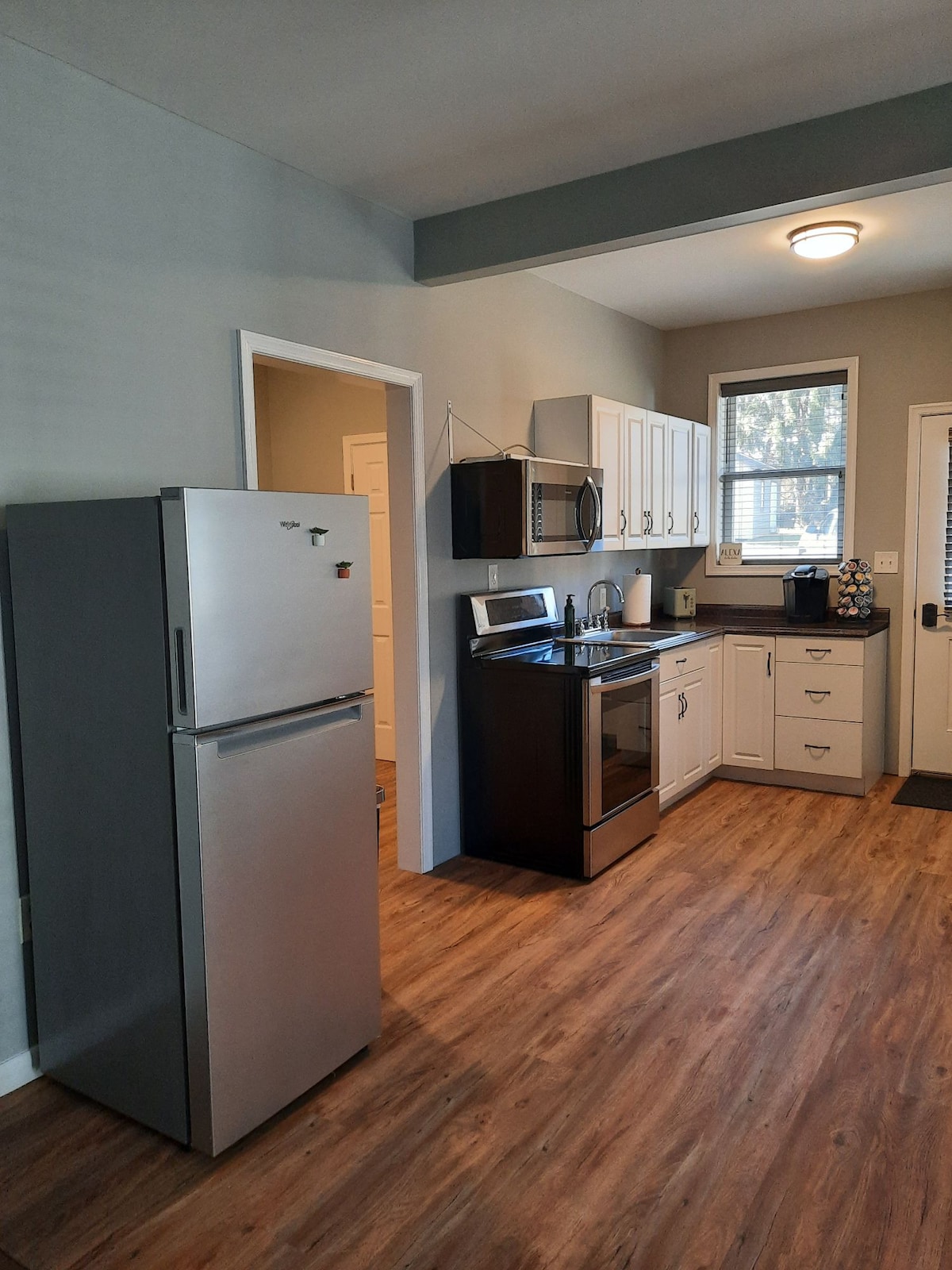 Détendez-vous et profitez de cet appartement confortable et récemment rénové avec un lit King Size, un salon confortable avec une télévision intelligente pour vous connecter à vos comptes, un coin repas, une cuisine avec tout le nécessaire pour cuisiner, une salle de bain complète, un espace de travail pour les voyageurs qui travaillent, un lave-linge et un sèche-linge dans l'appartement. Les voyageurs pourront également profiter de la terrasse avec vue sur la cour arrière/le bois et un coin de feu. Vous pourriez voir/rencontrer Dave (qui habite à côté) quand il va et vient, c'est un excellent voisin et il respectera la vie privée des voyageurs.