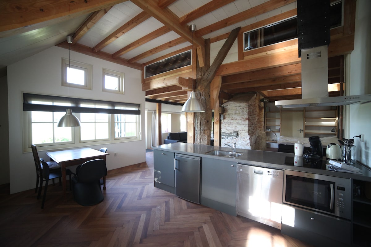 Lodge de luxe moderne entièrement neuf avec sauna. Profitez de la paix et de l'espace depuis le salon et la terrasse avec vue dégagée sur le moulin. Détendez-vous dans votre sauna privé et rafraîchissez-vous à l'extérieur sur la terrasse. Y compris l'utilisation de serviettes de bain et de peignoirs. À distance de marche, vous pouvez commander de la nourriture au restaurant de Molenschuur. Le Lodge est proche du centre d'Alkmaar et de la plage de Bergen ou d'Egmond. Promenez-vous également dans les dunes de Schoorl.