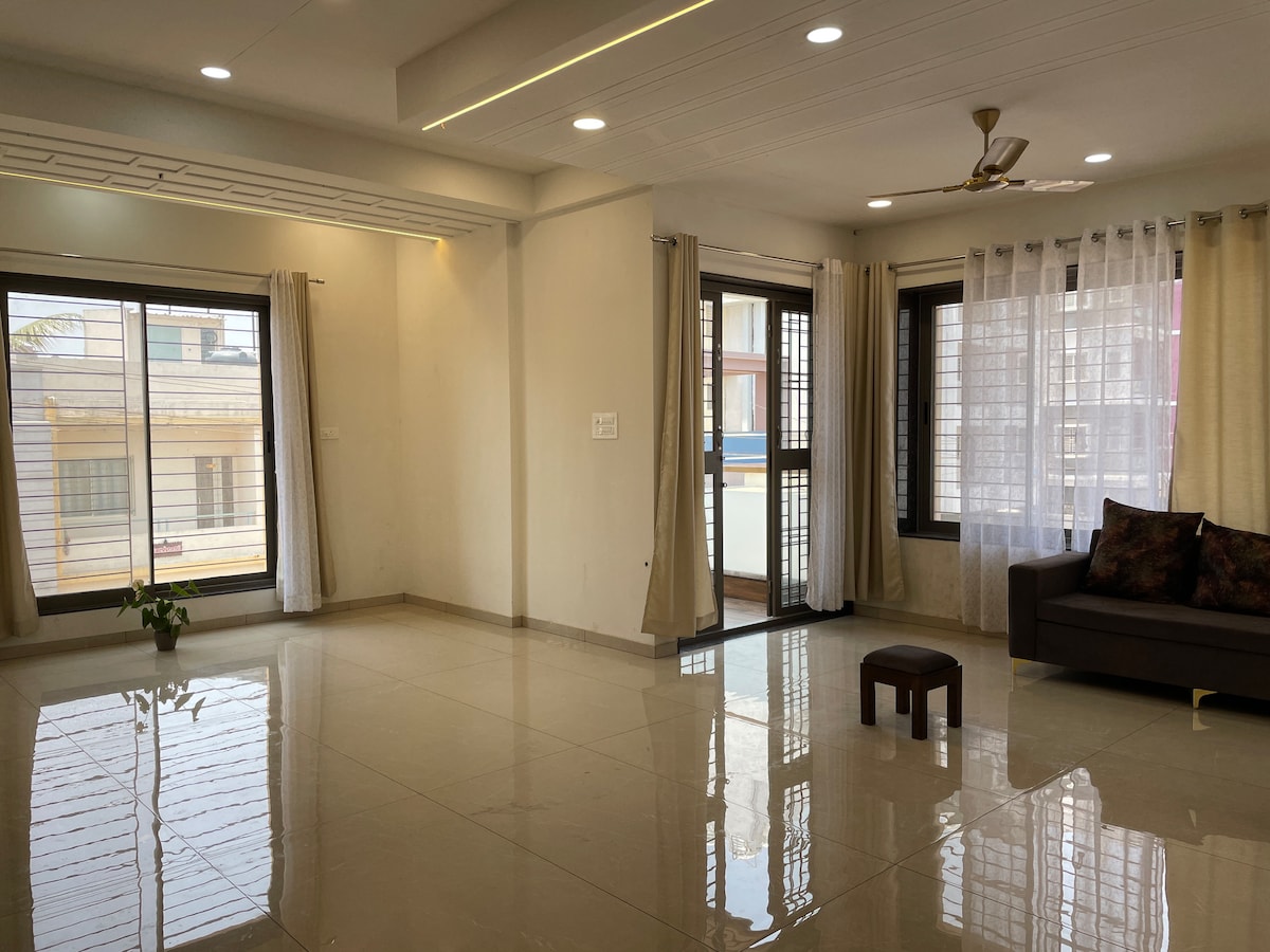 Situé à 5 minutes de la gare et de l'arrêt de bus central de Kolhapur. Cet appartement luxueux offre des intérieurs chics comprenant 2 chambres avec salle de bains privative + canapé-lit et literie supplémentaire pour 4 personnes supplémentaires. Attendez-vous à une cuisine entièrement fonctionnelle, mais Swiggy et Zomato sont à peu près disponibles. L'espace aéré situé au milieu du centre résidentiel au 4e étage au cœur de la ville. L'ascenseur est juste à l'extérieur, facilement accessible. Cet appartement est disponible uniquement pour les familles.