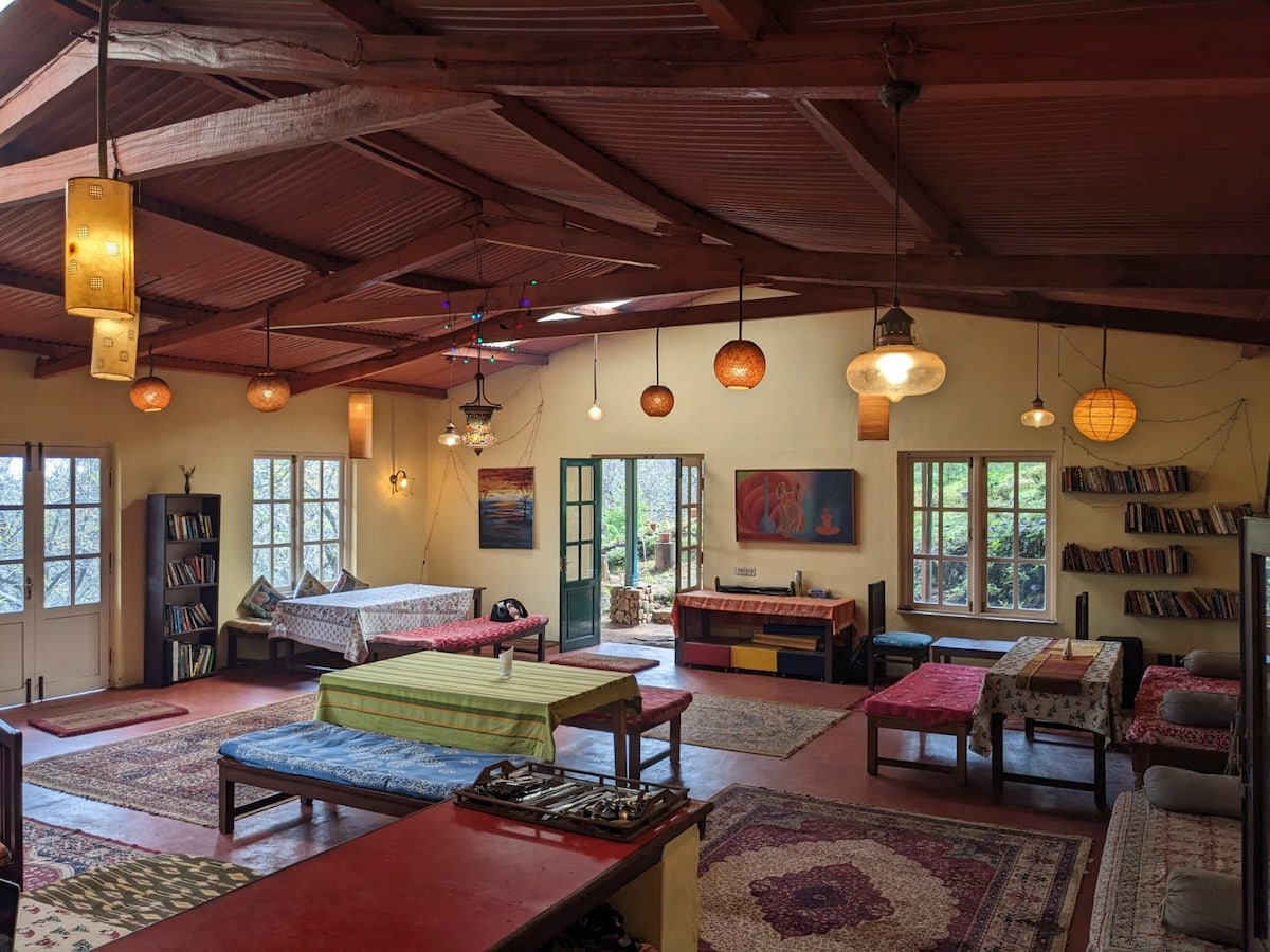 The Artist est notre plus petit cottage, le plus confortable, idéal pour 2 personnes maximum. Elle est entourée d'eucalyptus et se trouve à quelques pas du ruisseau qui traverse la ferme. Tous les cottages et la salle à manger commune disposent du wifi, de l'eau chaude 24h/24 et de l'électricité. Nous sommes accessibles en voiture et il y a un parking à la ferme. Des repas végétariens et non végétariens de style maison sont proposés à la ferme : Petit-déjeuner - 250 Rs par personne Déjeuner - 300 Rs par personne Dîner - 400 roupies par personne.