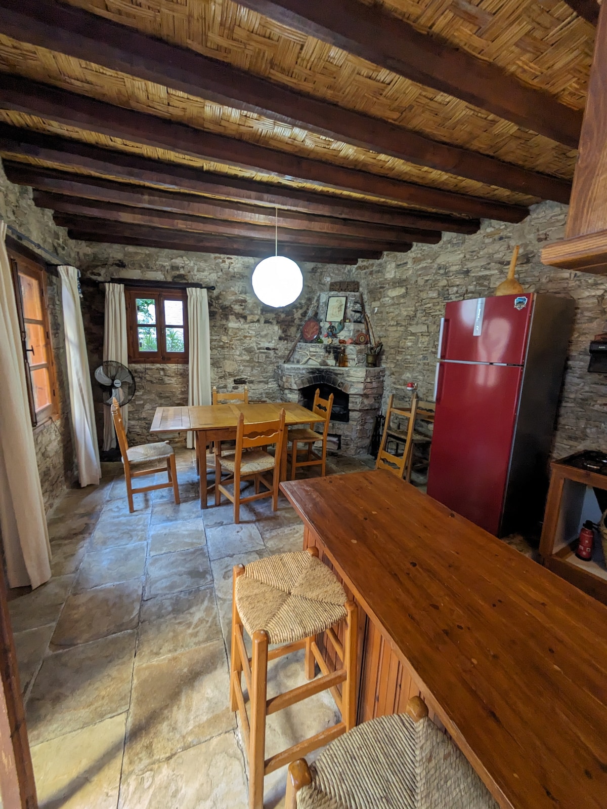 La maison en bois est située à 300 mètres du village pittoresque de Gourri, dans la forêt de pins entre les villages de Gourri et Fikardou. Les visiteurs peuvent rejoindre la place du village et les commerces en quelques minutes à pied. Le logement est situé dans une clôture de trois niveaux de 1200 m². Deux maisons indépendantes sont placées dans la parcelle, chacune à un niveau différent. La maison est située au troisième niveau de la parcelle avec une vue idyllique sur le coucher du soleil, les montagnes et les sons de la nature.