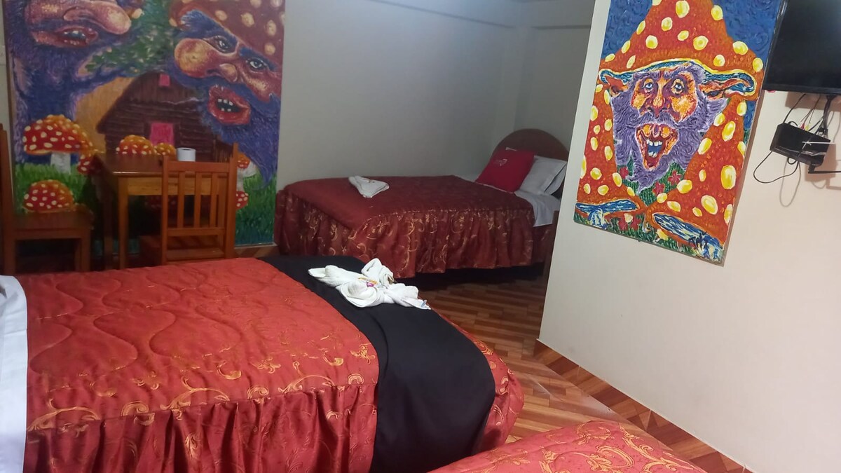 Chambre privée spacieuse et lumineuse de 7 x 4 m avec vue directe sur un jardin luxuriant de 9 x 9 m. Une partie de Tayta Wasi, une maison d'hôtes spirituelle et artistique au cœur de Pisac. Le jardin est un espace de vie partagé : des musiciens, des voyageurs et des amis y passent souvent, ajoutant une bonne énergie et un flux artistique. La pièce comprend un canapé, une table, un tapis et de la lumière naturelle. Cuisine commune, salles de bains propres, et petit déjeuner disponible dans notre café pour 15 S/. Un endroit pour se reposer, créer et profiter d'une ambiance positive.