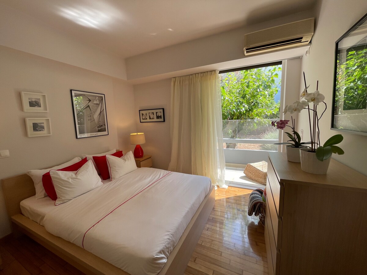 This is a detached house, in a beautiful mediterranean garden with a private garage, located in the very heart of leafy Kifisia, one of the most privileged suburbs of Athens. It has a spacious living/dining room, master bedroom, auxiliary bedroom, kitchenette and bathroom. Next to Kifissia's park, one minute walk to cafes, restaurants, boutiques, movie theatres, museums. Fast Wifi 90-100mbps. Only two blocks from Kifissia Metro station. Additional charges apply for more than three guests.