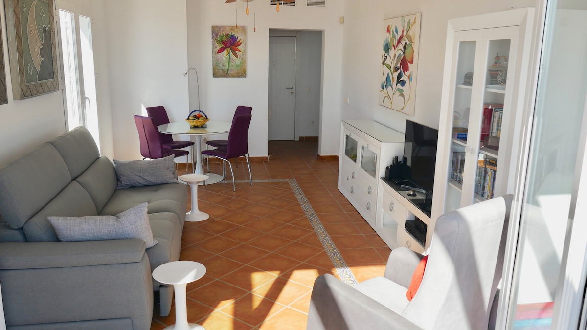 VFT/AL/08968 Enjoy all-year sunshine at this fully equipped, 2-bedroom apartment in the heart of Mojacar Playa • Red Cross round-about area • Large south-facing terrace • Stunning mountain views • Fully equipped kitchen • Washing machine, dishwasher and microwave • Cold/hot air-con (paid) • On-site parking • Communal pool • Peaceful and quiet complex. No parties allowed • Beach, bars and restaurants at the end of the road (5 min walk) • Suitable for longer winter stays too