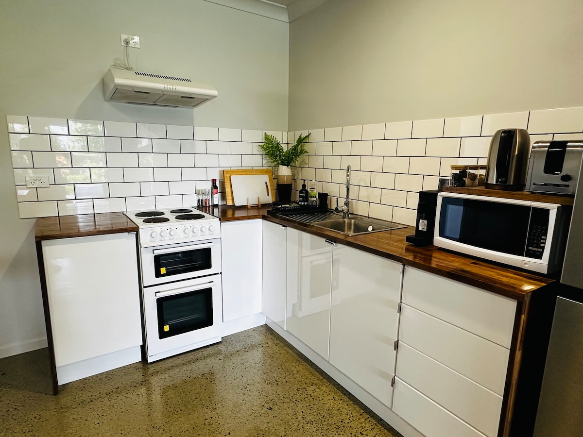 Cette grange de construction unique située dans l'arrière-pays de la Gold Coast se trouve à distance de marche des parcs nationaux. Fabriquée à partir de bois de quai recyclé, la grange est située sur une ferme de 18 acres entourée de pelouses vertes. Un lit king size avec salle de bains attenante, douche et baignoire séparées composent la chambre du loft. En bas, vous trouverez une deuxième salle de bain/buanderie, une cheminée, un salon, un bureau et un lit autogonflant (draps de lit gonflables non inclus), une salle à manger et une cuisine entièrement équipée avant de marcher sur une grande terrasse donnant sur la forêt tropicale.