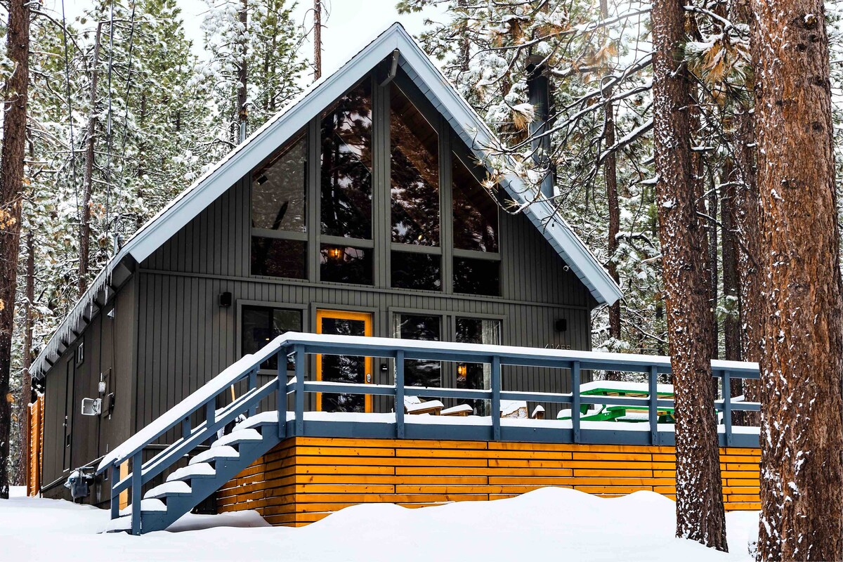 Rancho Pines est un chalet en A classique avec un nouvel équilibre de cuisine moderne et de charme rustique. Idéalement situé à seulement 1,5 km du village et de la station de ski Snow Summit sur un cul-de-sac calme, c'est exactement là où vous voudrez être. Cuisine rénovée, salles de bain sur le sol naturel de la rivière. Sortez sur une terrasse enveloppante de 280 degrés, avec barbecue, coin salon et jacuzzi privé. (Pas d'animaux de compagnie) J'ai une caméra extérieure qui surveille l'allée pour des raisons de sécurité