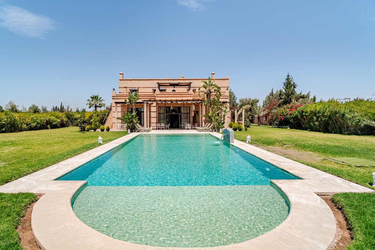 C'est une villa de 4 chambres plus 4 SDB, sur 5000m² de jardin, 400m² habitable. avec UNE PISCINE PRIVEE de 15mx7m et un jardin privé clôturé. elle dispose d'un salon, une salle à manger, une cuisine équipée, un lave main et WC, une terrasse avec une vue su l'Atlas. Une navette GRATUITE pour 10 places est disponible tous les jours avant 19h vers le centre de Marrakech. la restauration, le ménage et la cuisine sont disponibles tous les jours sur demande, avec soins de Hammam et massages.