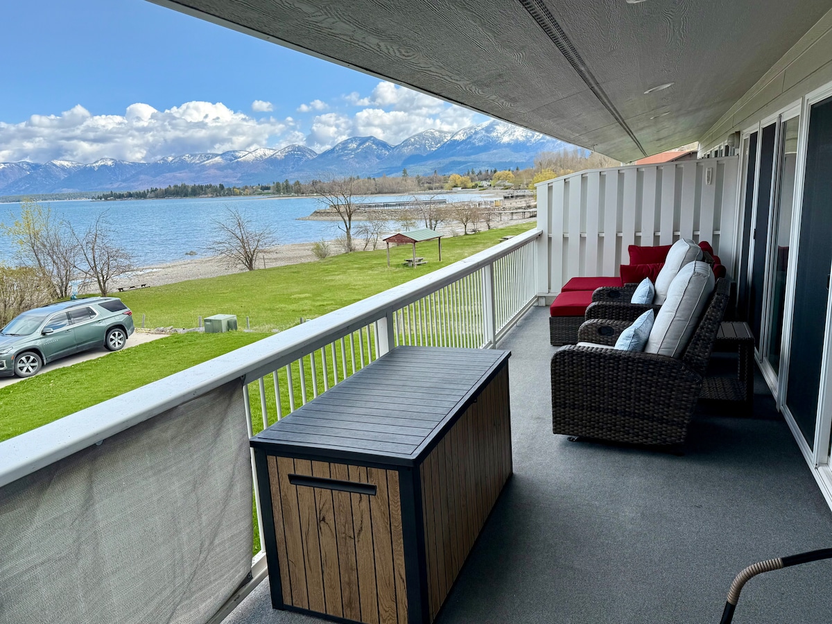 Profitez d'une vue imprenable sur le lac Flathead depuis cet appartement au dernier étage (facilement accessible par une rampe). Détendez-vous au balcon, faites un barbecue ou détendez-vous avec des cocktails tout en profitant de l'ambiance sereine au bord du lac. En dessous, accédez au centre de fitness, à la plage privée et au quai. À l'intérieur, de grandes fenêtres remplissent l'espace de lumière naturelle, et la cuisine entièrement équipée et le salon confortable offrent du confort. L'accès privé au lac se trouve juste en dessous, ce qui en fait l'endroit idéal pour le plaisir et la détente de l'eau.