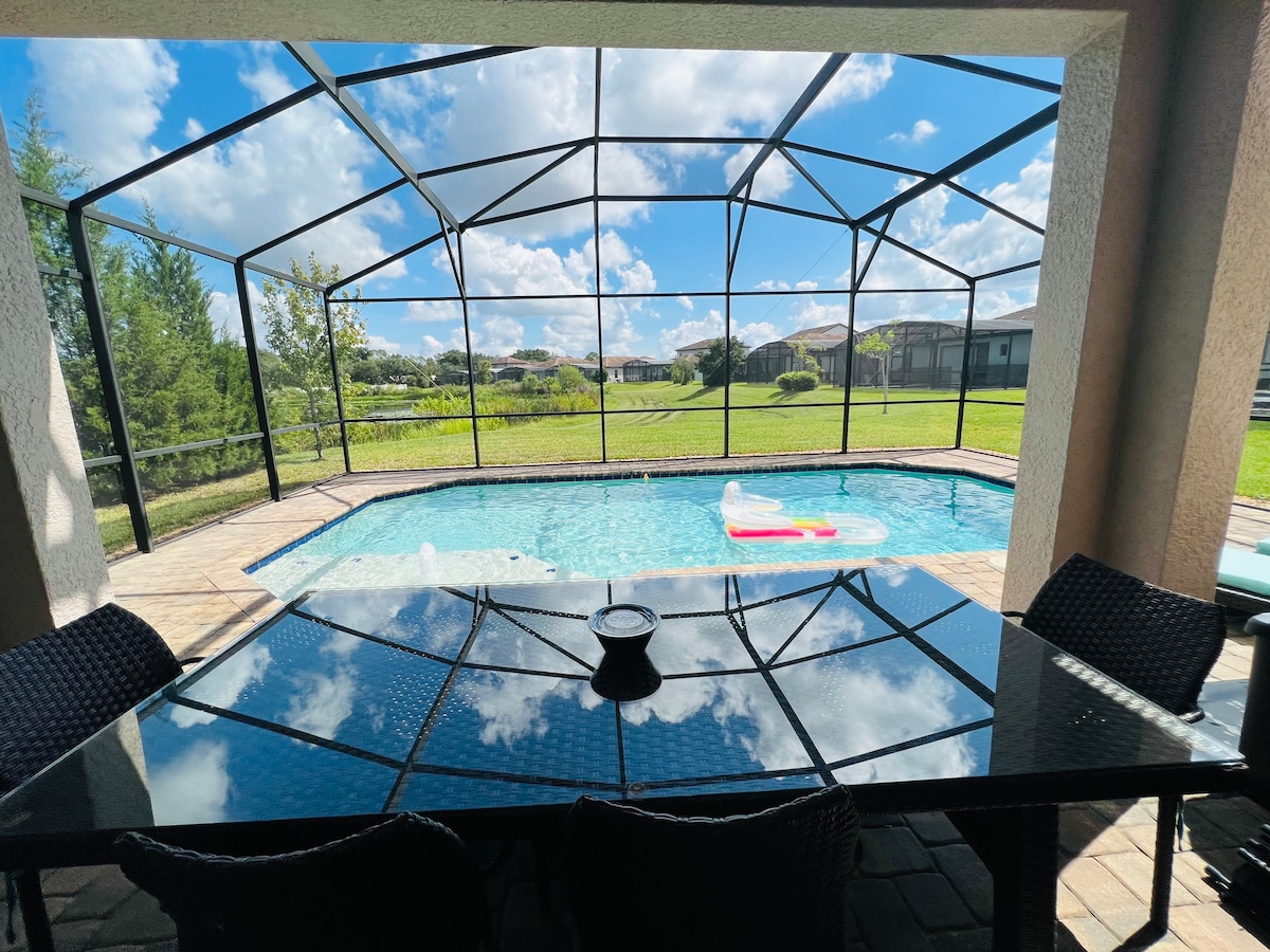 New two story home with private pool, patio, barbecue area & game room. Surrounded by parks, gardens, tranquil lakes & walkways with breathtaking views. Resort amenities located right across the street with an amazing clubhouse (private owned), Bar & Grill restaurant, water park, arcade and gym (extra fee), soccer & football field, & event center for parties & weddings. (Pet free home) 12 mi Legoland/19 mi Disney/26 mi SeaWorld & International Drive/29 mi Universal Studios.