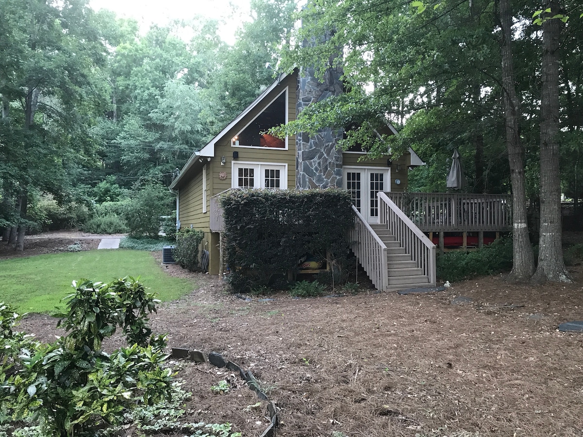 Welcome to our Lake Oconee Cottage! Fully stocked kitchen and all of the supplies you need! 1200 sq ft of space; 2 Queen BR’s, 2 sitting areas, pullout couch, 2 couches, leather recliner, 2 decks, grill, fire pit, kayak, floats, swimmable cove and tree swing! Fast Wifi. SmartTV. Private woods and dock to explore! Great land and lake location. Fantastic view! Swim out “beach” on a clean cove. Marina around corner. Quiet lakefront property, private, but minutes to everything!