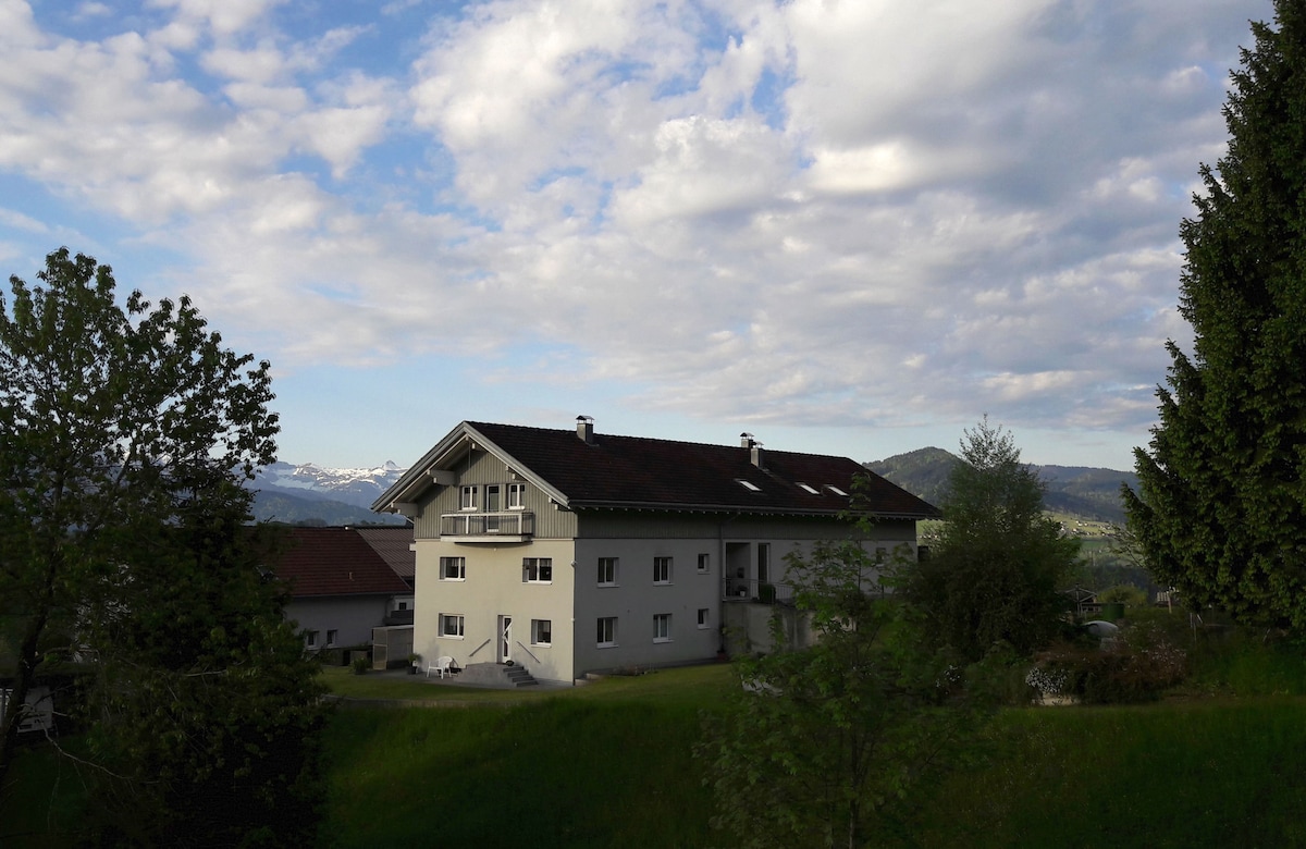 À seulement 10 minutes de Bregenz et du lac, nous proposons un appartement spacieux, avec terrasse pour se détendre et vue sur la forêt de Bregenz. Vous pouvez également profiter de l'emplacement sans voiture. Le bus passe toutes les demi-heures juste devant la maison et vous emmène au centre. L'appartement dispose de deux chambres, d'un lit d'appoint pour les tout-petits, d'une cuisine complète avec des appareils de haute qualité, y compris un lave-vaisselle et une machine à café. Des sentiers de randonnée et des pistes cyclables se trouvent à proximité immédiate de la maison.