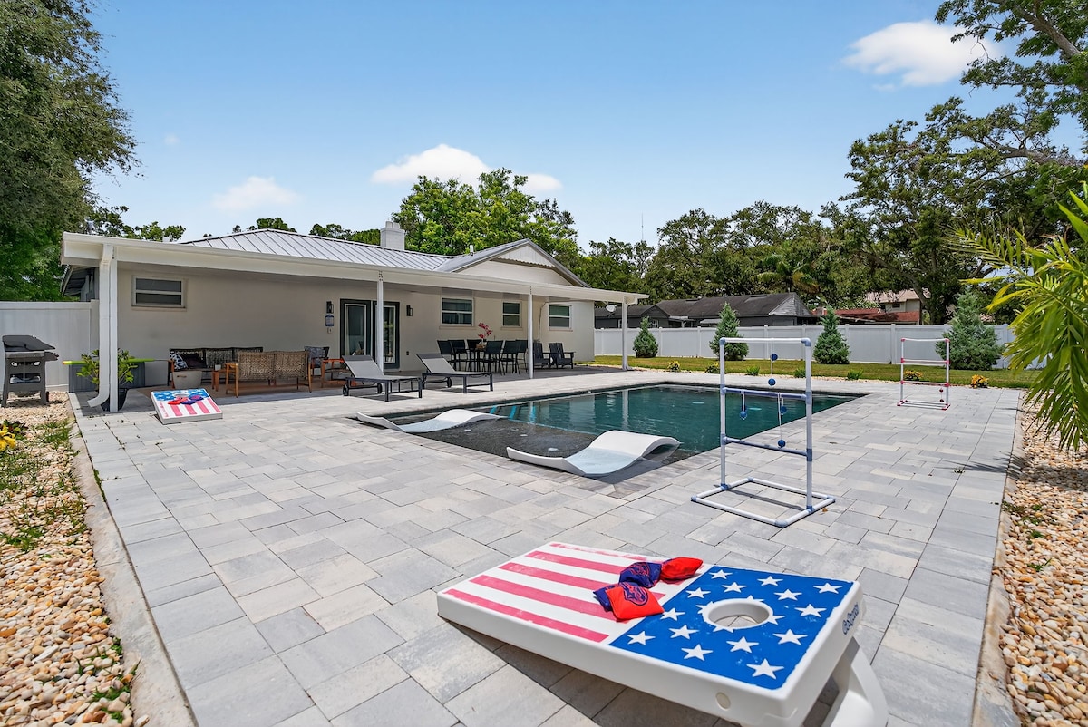 🏡 Créez des souvenirs inoubliables dans cette maison accueillante de 4 chambres et 1 salle de bain avec piscine chauffée, pouvant accueillir confortablement jusqu'à 10 personnes. Elle est parfaite pour les familles et les groupes. À seulement 20 à 25 minutes de l'aéroport international de St. Pete–Clearwater et à 10 à 15 minutes de l'aéroport international de Tampa, et à seulement 25 à 30 minutes des meilleures plages comme Clearwater Beach, Madeira Beach et St. Pete Beach. Vous serez également à quelques minutes en voiture des centres commerciaux, des parcs, des terrains de golf, des restaurants et des attractions locales !