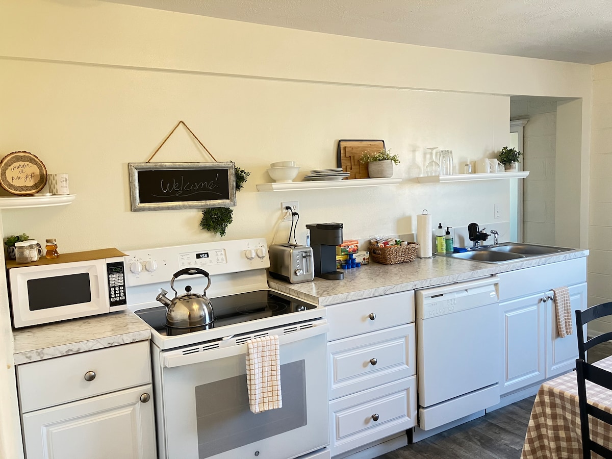 Toutes les commodités dans une suite familiale de 1 chambre et 1 salle de bain ! Entrée séparée de la maison principale et votre propre place de stationnement dans l'allée. Situé dans un cul-de-sac calme, mais à distance de marche des parcs. À 5 min en voiture du centre-ville. Kitchenette, grande table, canapé confortable, bureaux pour les postes de travail, ainsi qu'une connexion Internet rapide de 200 Mo/s, en font l'endroit idéal pour tout ce que votre voyage peut vous réserver.
