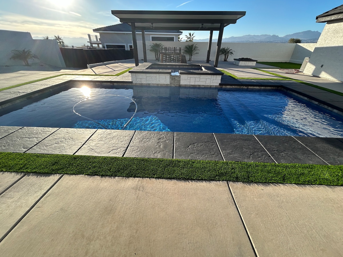 Détendez-vous et profitez du paysage désertique. Maison entière isolée, privée et spacieuse de 2 200 pieds carrés avec piscine chauffée et jacuzzi (voir le règlement intérieur). Maison entièrement personnalisée, magnifiquement décorée avec des meubles design partout. À 10 min du pont Laughlin et de Katherine's Landing, mais un monde à part. Calme, paisible, privé, avec une vue incroyable sur les étoiles, les lumières de la ville, les paysages de montagne. Une escapade unique dans le désert. Beaucoup de stationnement facile et sûr pour bateau ou remorque, accès facile aux sentiers.