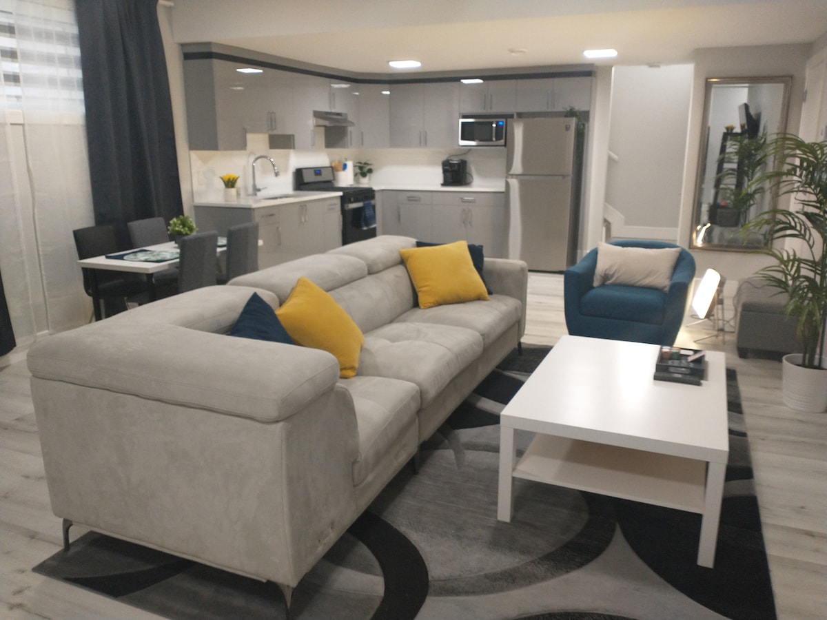 This private basement unit offers a perfect blend of modern living, spaciousness and comfort, with a main floor feel. It presents a welcoming atmosphere, perfect for entertaining guests or simply relaxing after a long day. The chef's kitchen boasts sleek stainless steel appliances, making cooking a joy. The bedroom is a cozy retreat with a king-size bed and numerous pillows for your comfort. This location provides easy & quick access to the int'l airport, local amenities, parks and more.