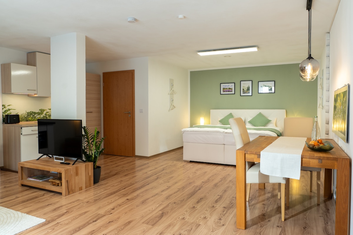 Vous aimez être dans la nature et pourtant rapidement en ville ? Vous aimez faire de la randonnée, travailler au calme ou simplement vous détendre sur la terrasse ? Alors vous êtes au bon endroit dans cet appartement confortable d'une pièce récemment rénové. - Lit King size 180 cm à ressorts - Design confortable et élégant - Wifi rapide - Terrasse avec barbecue à gaz - Self check-in - point de départ idéal pour les randonnées et les balades à vélo - 20 minutes en voiture de Schwäbisch Gmünd