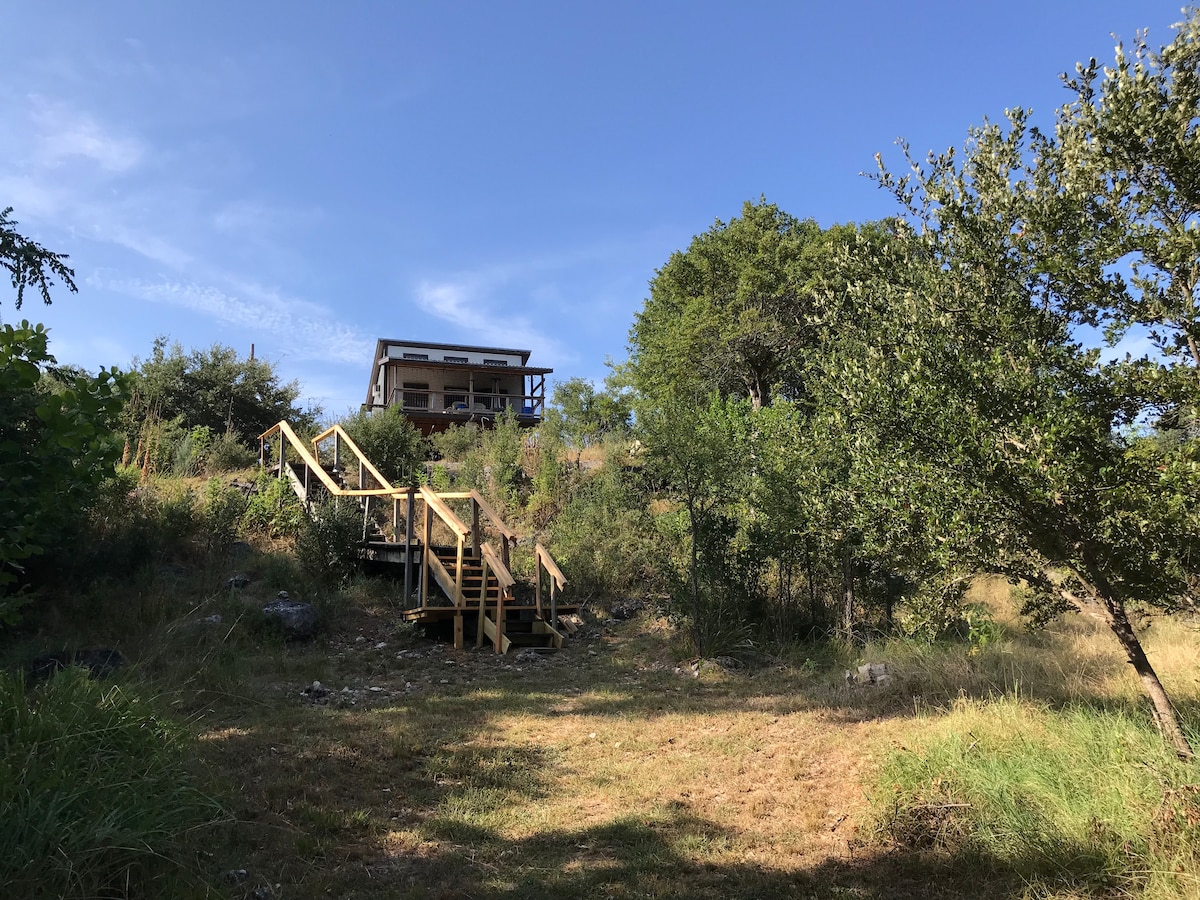 Étoiles et nature de Hill Country sur la rivière Medina. À 25 min de Bandera. Cabane artistique de 400 pieds carrés sur 1/2 acre privé, terrasse couverte, table à manger, chaises longues, barbecue, pataugeoire, randonnée. Haut débit, Internet, TV. Profitez d'un séjour paisible et privé parmi les arbres, les oiseaux et les cerfs. Visitez Bandera, la capitale des cow-boys du Texas, ou faites de la randonnée dans la zone naturelle de Hill Country State. Parfait pour un couple, 1 à 2 enfants. Animaux de compagnie avec autorisation préalable. Lit queen size, petit canapé-futon pour 2 enfants. Cuisine complète, salle de bain complète avec grande douche.