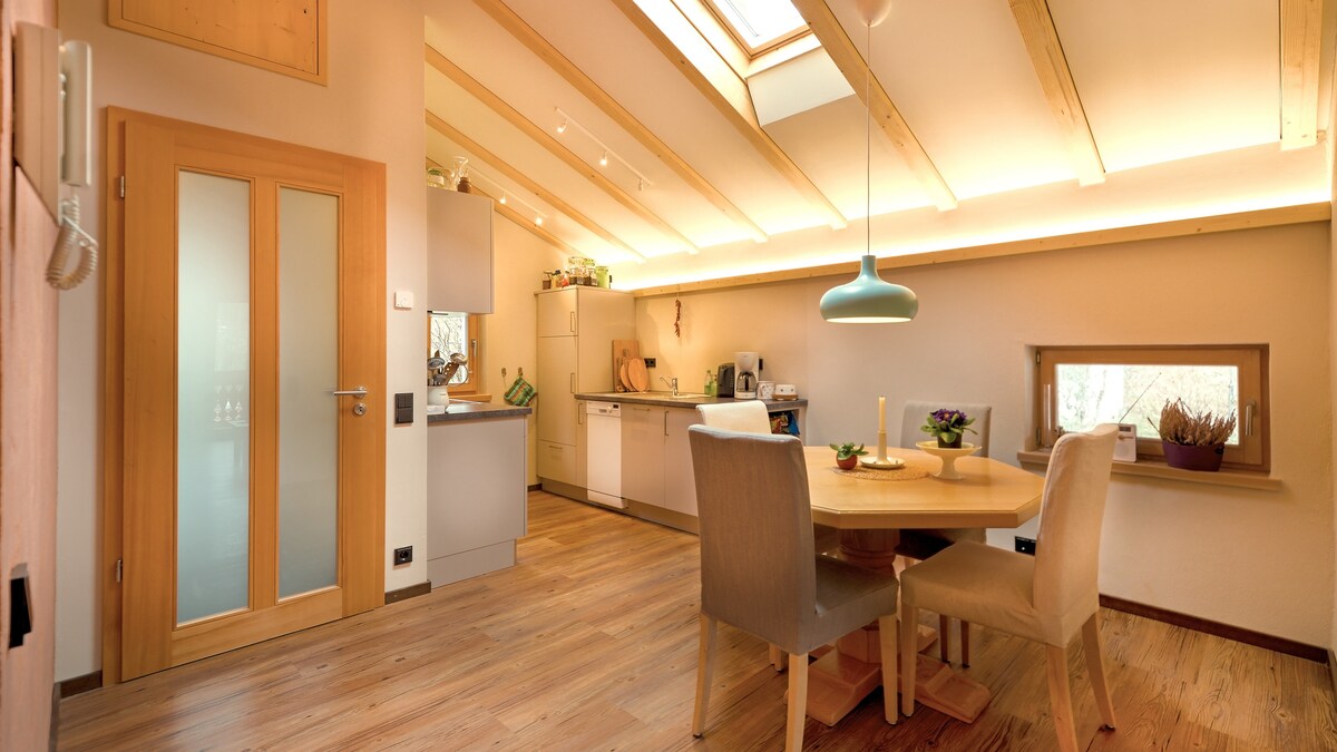 Charmant et confortable appartement mansardé avec de hauts plafonds, des poutres apparentes, un balcon ensoleillé à l'ouest, une cheminée et un salon/salle à manger ouvert pour les familles. Notre appartement de 80 m ² est situé dans un quartier calme, juste en dessous du château de conte de fées du roi Louis II de Neuschwanstein et surplombe le château de Hohenschwangau. En 15 minutes à pied, vous êtes au lac d'alpage et à l'ascension des châteaux. Chez nous, beaucoup de belles randonnées pédestres/ cyclistes commencent. Schwangau est à 2,6 km, Füssen à 4,2 km.
