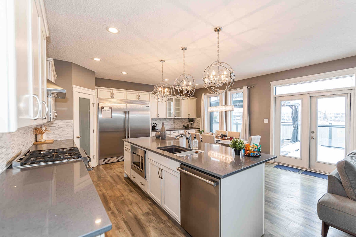 Nichée dans le charmant quartier de Keswick à Edmonton, notre maison de deux étages fraîchement construite allie élégance et confort, conçue pour rendre votre séjour inoubliable : Maison de 2 étages nouvellement construite Environ 1400 pieds carrés. Chambres : 3 (chambre principale avec lit King Size, 2 chambres avec lit Queen Size) Salles de bain : 2,5 Climatisation Double garage Divertissement : Apple TV WiFi ultra-rapide Buanderie sur place Cuisine entièrement équipée À 15 minutes de l'aéroport international d'Edmonton Proximité du quartier commerçant principal