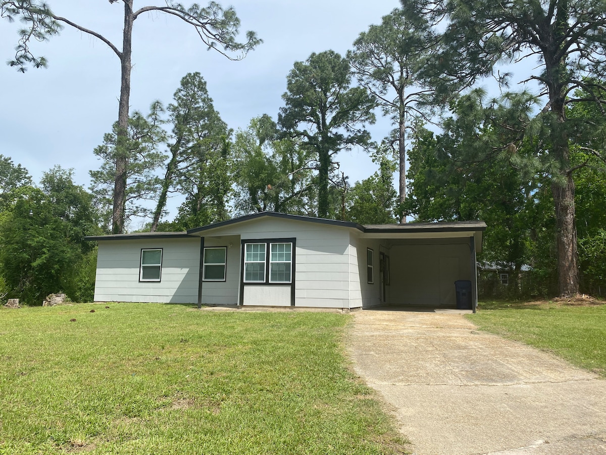 Ma maison se trouve sur 1,4 acres 5 min de Leesville et 10 min de Fort Polk. Il se trouve sur une route de gravier sans issue d'un demi-mille de long avec très peu de circulation. Cet emplacement est privé. Les deux côtés de la propriété sont bordés par des terres forestières. Profitez du foyer extérieur, des chaises longues, du barbecue, du jeu de poches et du Jenga surdimensionné dans un cadre privé. La rampe de bateau du lac Vernon est à moins de 5 miles ! N'hésitez pas à me contacter si vous avez besoin d'un hébergement spécial. J'utilise un service de nettoyage local.