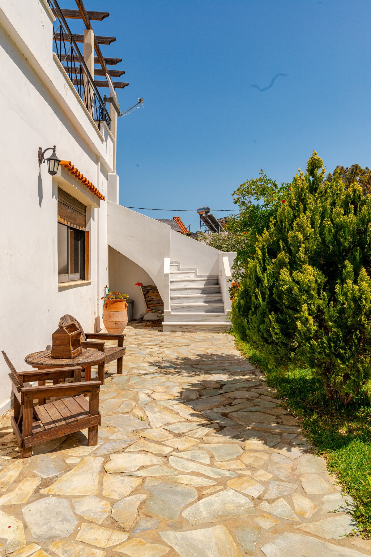 La maison de plage est entourée d'un jardin privé avec vue sur la mer et de beaux couchers de soleil tandis que la plage est à distance de marche. Un environnement très calme et silencieux est prêt à accueillir tous les voyageurs et à les laisser profiter d'un séjour grec. Les voyageurs peuvent profiter de toute la maison et le jardin et se détendre sous le soleil et la vue sur la mer. Il y a également un espace barbecue extérieur.