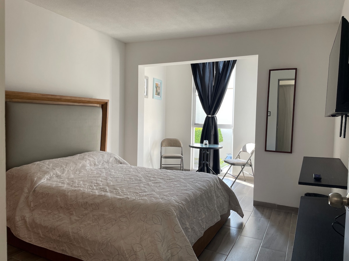 ¡Despierta con una vista que te enamora! Disfruta tu café en el balcón mientras la luz del amanecer llena el espacio. Este departamento cálido y acogedor es ideal para descansar o trabajar cómodamente. Cuenta con cocina equipada, A/C, cama confortable y estacionamiento gratuito. Ubicación estratégica y ambiente tranquilo para una estancia relajada en León.