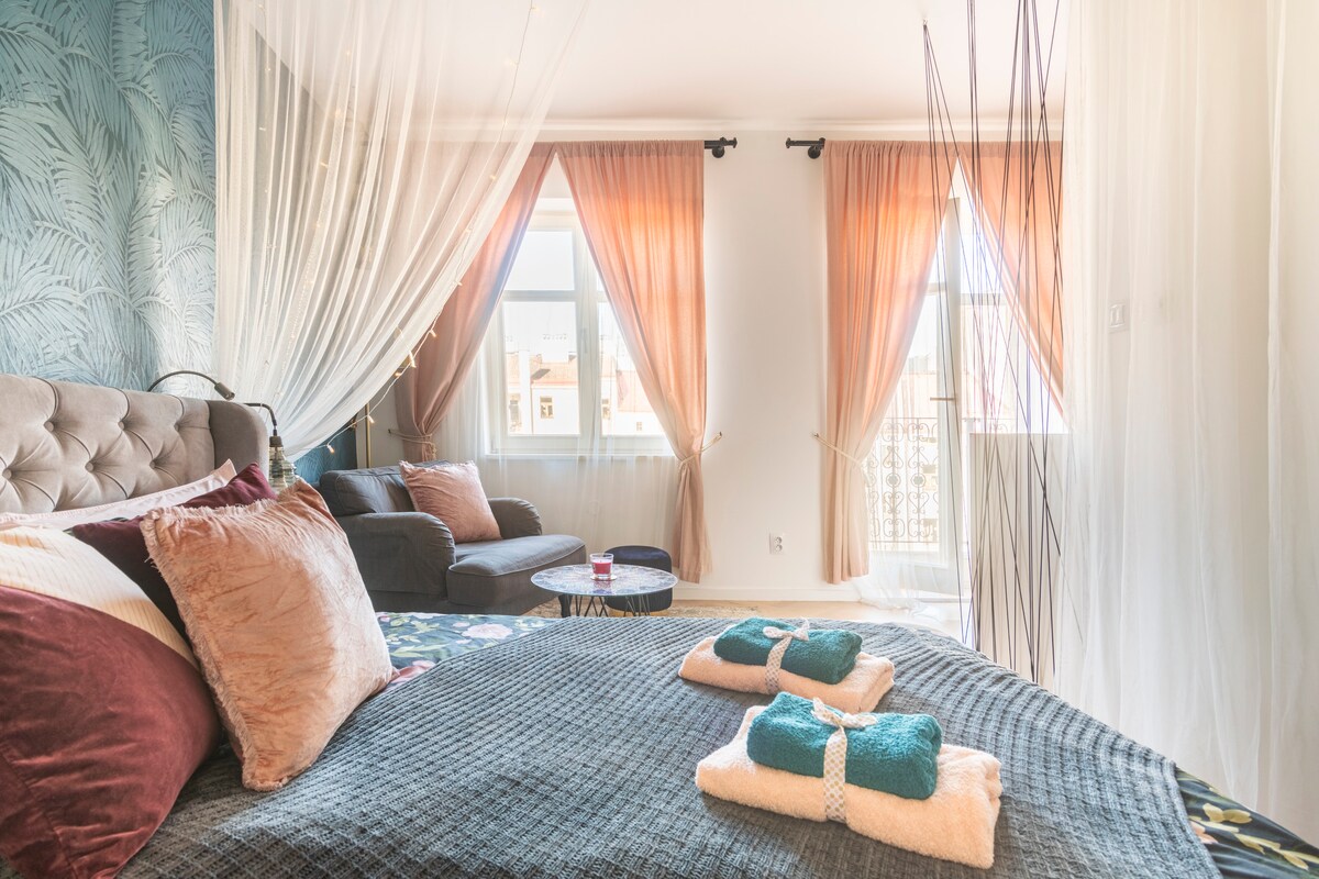 Réveillez-vous sur un lit somptueux avec un filet romantique et un éclairage à cordes. L'appartement a été conçu par Brunetti, un designer pragois renommé, avec un mobilier exquis et un miroir tendance. Un balcon privé fait face à la cour intérieure. Il y a un tout nouveau matelas orthopédique avec mousse à mémoire de forme de 2024 pour le meilleur sommeil de tous les temps :) Ce quartier génial vous permet également de profiter de la vie locale tout en étant proche du centre historique.