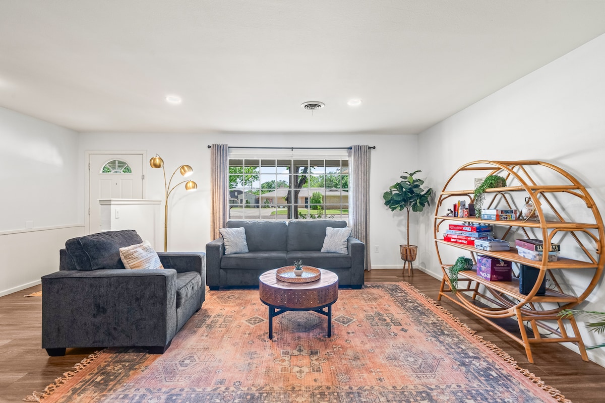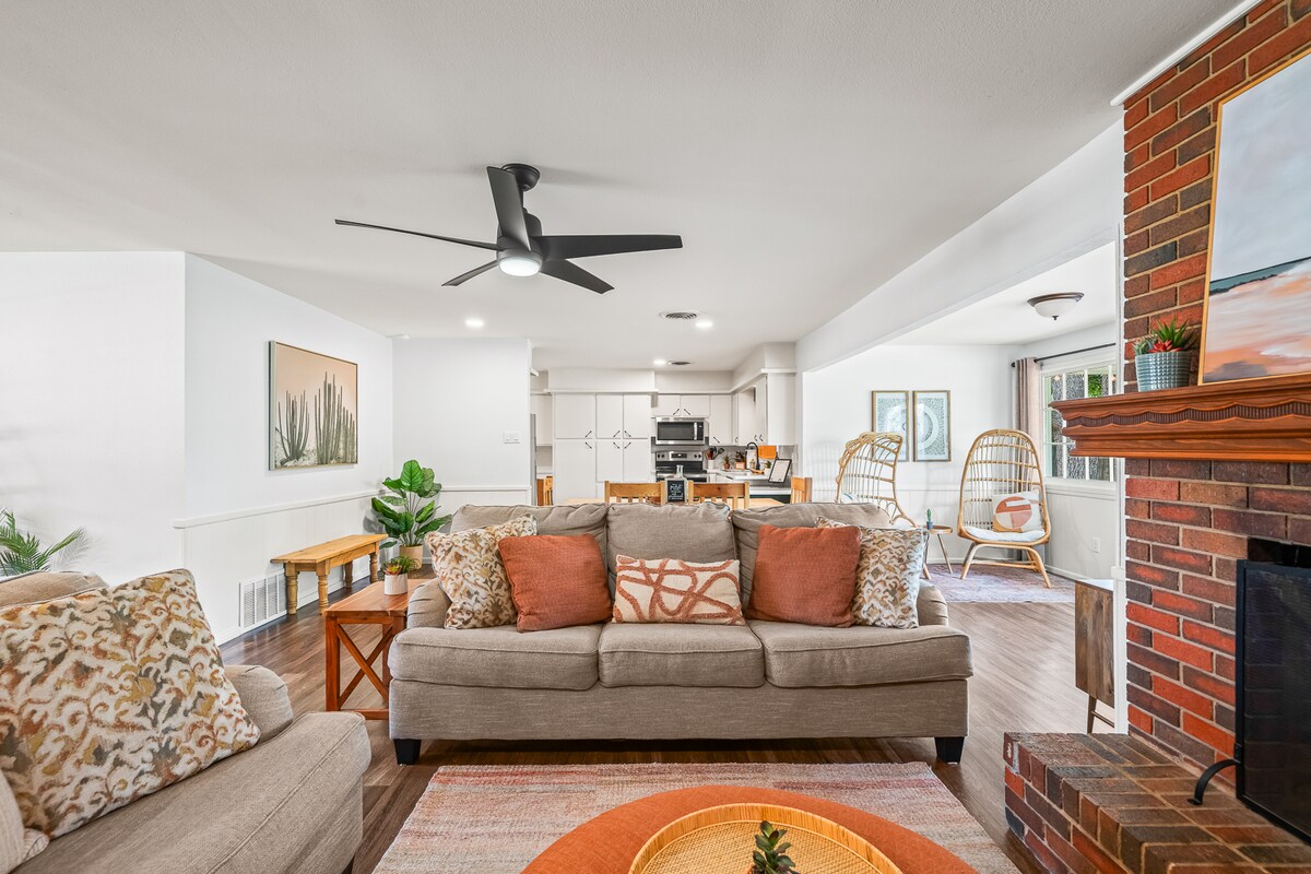 Cette escapade sur le thème Boho est idéale pour les familles et les séjours en groupe ! Doté d'une cuisine complète, d'une connexion Wi-Fi rapide, de deux espaces de vie et d'une télévision connectée 65"(Netflix gratuit, Hulu, Amazon). Récemment mis à jour dans tout le logement avec une atmosphère moderne et fonctionnelle conçue pour que les clients puissent se détendre et se délasser. Belle cour arrière avec de grands arbres, pelouse entièrement clôturée, patio arrière couvert et jeux de plein air, parfait pour recevoir des voyageurs. Au plaisir, nous sommes impatients de vous accueillir !