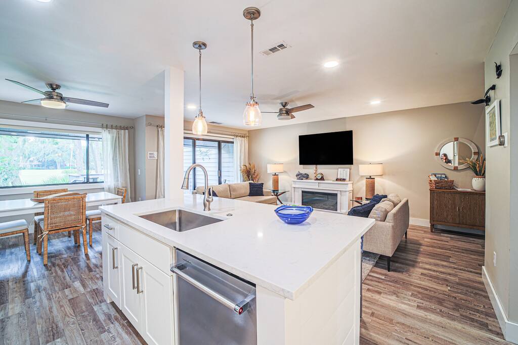 ✨Top 10% Guest Favorite✨ - Gated Beachfront Resort: Golf, Tennis, Pickleball, Pool, Restaurants & Bars! - Gorgeous Sunny Villa w/Panoramic Lagoon & Golf View! - Beautiful & Lush Scenery: Huge Old Oaks dripping in Spanish Moss! - Walk/Bike to Beach ●Walk to Shipyard Golf Club & Pub! ●Modern Coastal ●Sunny 1st Floor ●KING BED Master ●3 XL SmartTVs ●WIFI 287 mps ●Fully Stocked Kitchen ●Walk-in Shower ●Washer/Dryer ●Beach Chairs, Boogie Boards & More! ● BBQ ● Bike & Walk Paths ●Close to Coligny!