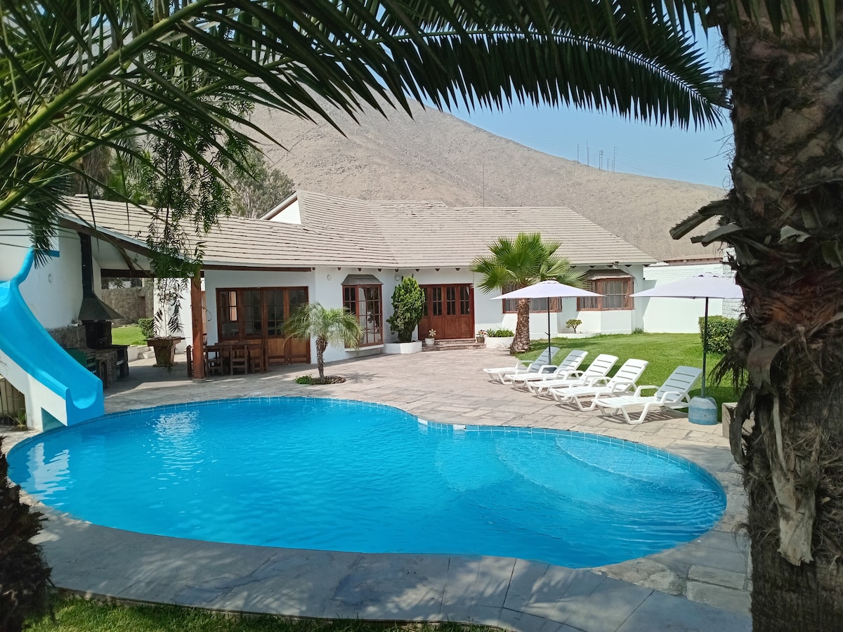 Linda casa de campo en una de las mejores zonas de Pachacamac, Lima , Perú. Un maravilloso lugar para descansar y pasar agradables momentos en familia o con amigos, con 3600 m2 de amplios jardines y bellos árboles para disfrutar y hacer actividades al aire libre, una gran y hermosa piscina y una zona de terraza y barbicue para preparar una deliciosa parrilla o una fabulosa pizza en el horno de barro. Y en el invierno podran pasar calidos momentos al lado de una chimenea dentro de la casa.