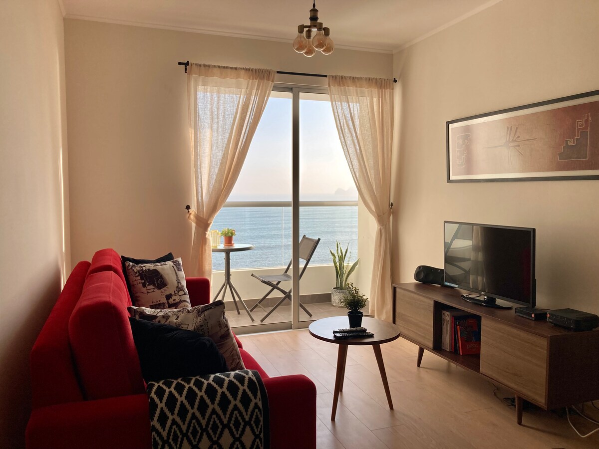 Appartement avec une belle vue sur la mer, à proximité de l'aéroport et des meilleurs sites touristiques de Lima, meublé avec tout le confort. Il se compose de : Salon, bureau, Kitchenette, 1 Chambre avec lit queen-size, 1 salle de bain 1 salle de bain et une terrasse avec vue sur la mer. Avec espaces sociaux : Salle de Cinéma, Salle de jeux, Cour avec Cuisinière, Blanchisserie, Salle pour Adultes, Gymnase, Sauna, Environnements de Grillades, Terrasse avec baignoire d'hydromassage, Piscine pour adultes et enfants.