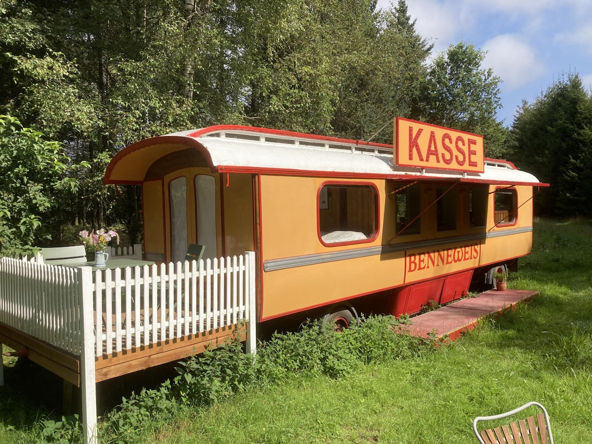 Overnat i den unikke billetvogn som tidligere var ejet af Cirkus Benneweis. Hvis du har været i Cirkus Benneweis, har du med garanti købt din billet ved billetlugen. Cirkusvognen er bevaret så original som overhovedet muligt. Vognen er opdelt i 3 rum: soveværelse, opholdsstue og køkken. Der er en 3/4 seng i soveværelset. Fra soveværelset kan du slå dørene op ud til en lille terrasse. I køkkenet er der et gasblus. Der er lys og strøm i cirkusvognen, men ingen varmekilde udover tæpper og dyner.