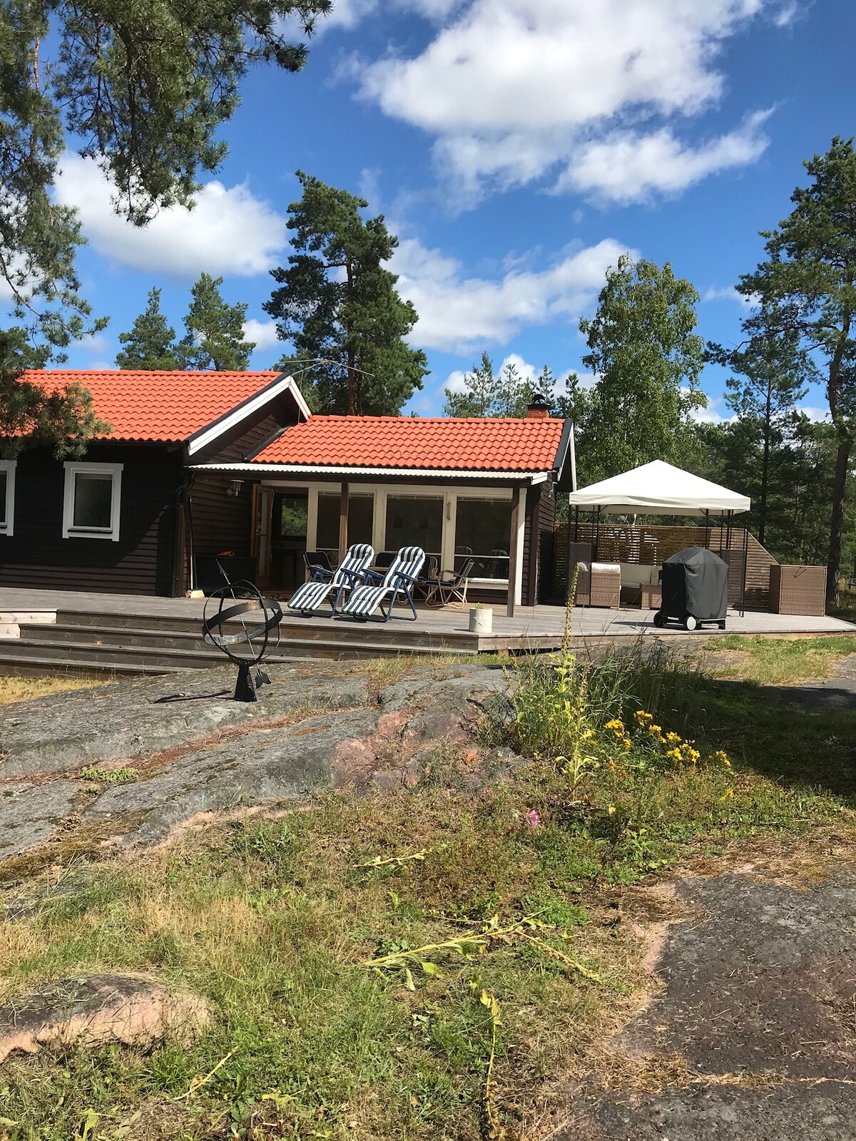 Bienvenue dans ce chalet de deux chambres et salle de bain donnant sur une vue imprenable sur le sud de l'archipel de Stockholm, et avec une jetée privée pour se baigner et se détendre. Les vélos de montagne/vélos, les kajaks, le sauna et le hottub sont à la disposition des voyageurs. Convient aux couples ou à la petite famille pour profiter d'un séjour de détente au port de Stockholm, avec la nature à votre porte. Coin salon privé à l'extérieur du chalet, avec cuisine extérieure entièrement équipée, barbecue et vue sur l'océan.