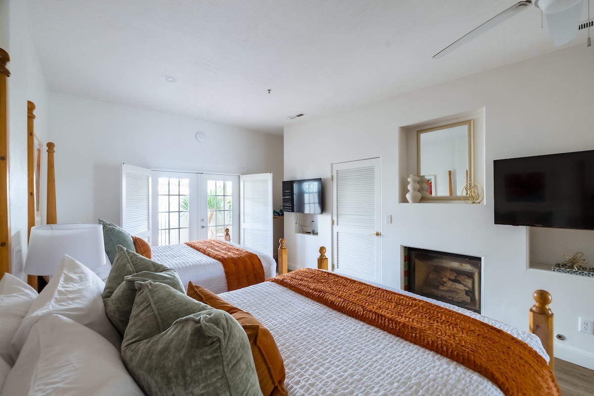 Ce logement unique a un style qui lui est propre. Venez vous détendre dans notre spacieuse retraite bohème avec une cuisine complète, un beau salon avec cheminée et un lit king size très spacieux avec baignoire spa en suite avec grande baignoire jacuzzi, douche à l'italienne et double vasque. C'est le luxe du désert dans toute sa splendeur. Le patio privé est un endroit idéal pour commencer et terminer votre journée avec des fauteuils à bascule, un salon de bronzage et une table à manger. En face de l'appartement se trouve la piscine pour adultes pour se détendre, se rafraîchir et se prélasser au soleil