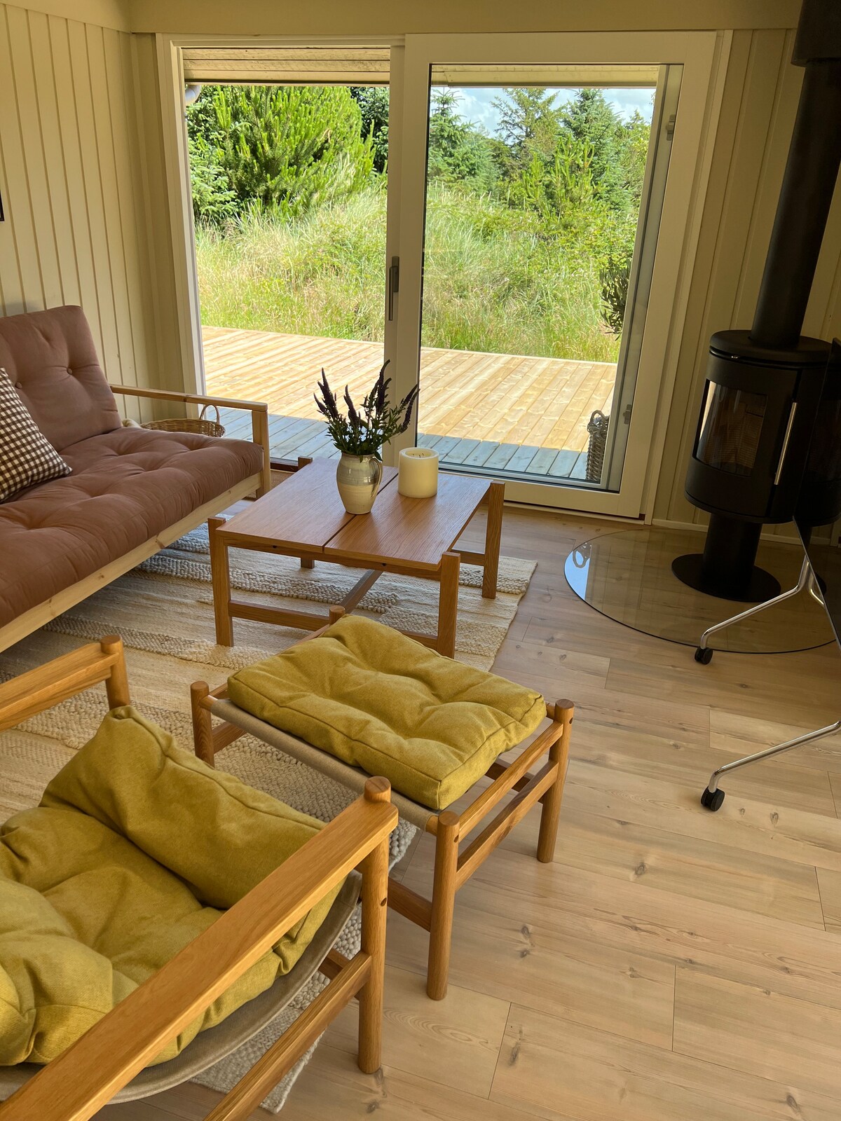 Orangerie unique avec 2 chambres et fenêtres panoramiques avec vue sur le grand jardin verdoyant, où vous pourrez profiter du soleil sur la terrasse après de belles promenades dans les bois et le long de la mer du Nord. La chaleur de la cheminée le soir donne l'ambiance pour parler et passer de longues soirées, et après une bonne nuit de sommeil, vous pouvez profiter des nombreuses excursions de la région à une courte distance en voiture. Vous pouvez acheter des produits frais à la ferme de la propriété et les préparer dans la mini-cuisine de l'orangerie. La maison est à seulement 5 min. en voiture de Fårup Sommerland.