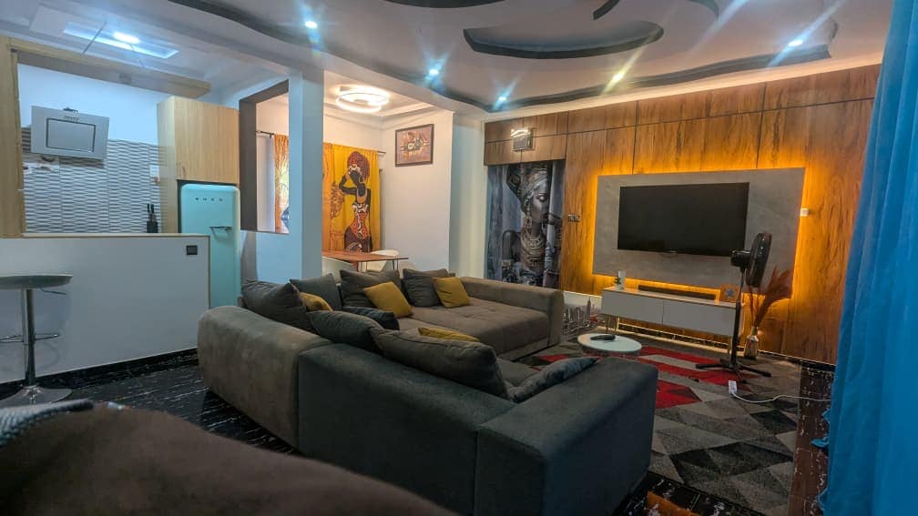 Nougat Business Apartment – Élégance afro-chic au cœur de Lomé Situé à Adewui, en plein centre-ville de Lomé, le Nougat Business Apartment marie subtilement l’élégance française et le charme africain. Pensé dans un style afro-chic aux tons chauds et naturels, cet appartement a été conçu pour offrir une expérience à la fois professionnelle, confortable et inspirante. Chaque détail a été imaginé pour que vous vous sentiez à la maison tout en profitant du confort d’un séjour haut de gamme.