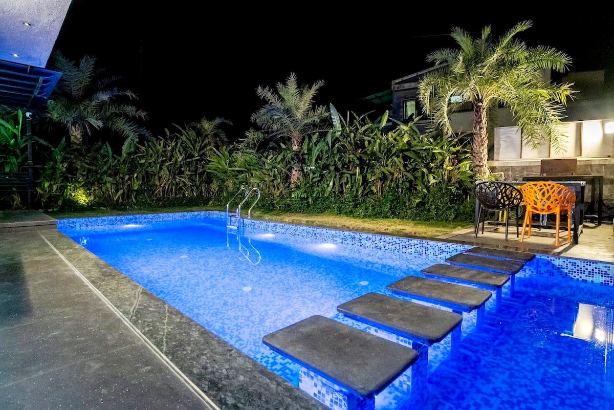 Welcome to our lavish private pool villa featuring elegant interiors with premium Italian-finish tiles ✨, designed for guests who appreciate comfort and style. Surrounded by scenic hills 🌿 and fresh mountain air, this villa offers the perfect blend of luxury and relaxation. Just 5 minutes from the city centre 🚗 and under 10 minutes from Lonavala Station 🚉, you enjoy both prime convenience and peaceful surroundings — making it perfect for families 👨👧👧, friends 🥂 & celebrations 🎉.